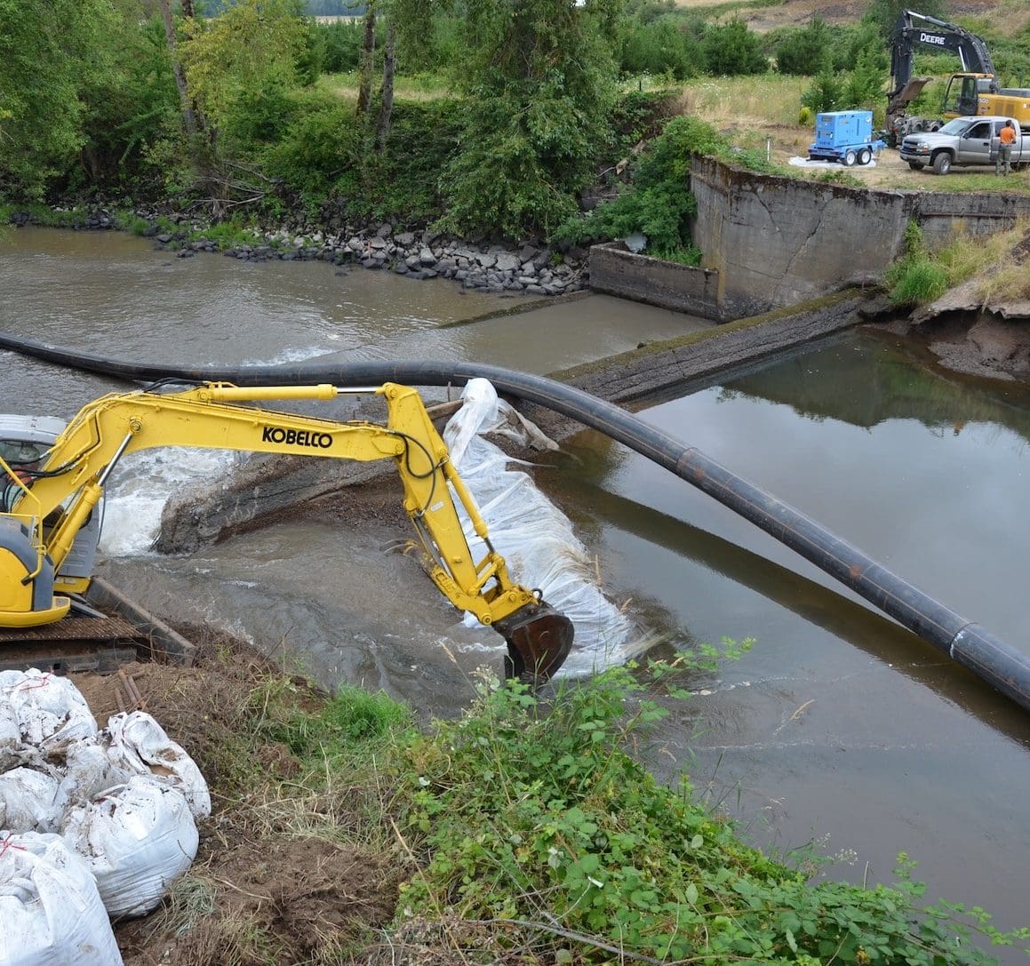 The Shearer Dam was also originally a push-up dam, then later a wooden crib dam and finally the concrete structure that was removed, built in 1956. The dam’s purpose was to divert Calapooia River flows to the Mills via a human-dug channel (mill race).